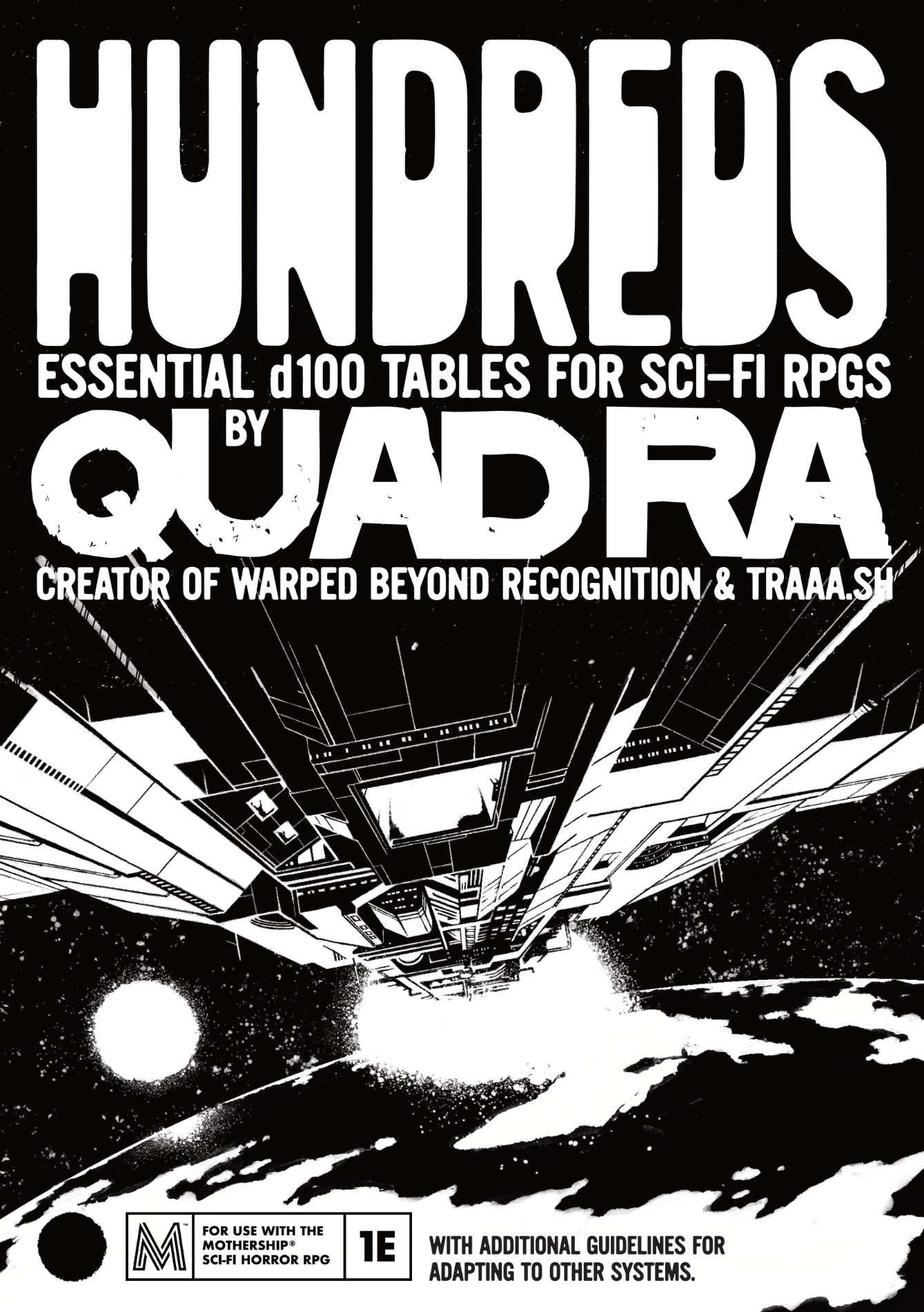 HUNDREDS is a book for Mothership RPG and other sci-fi, cyberpunk, and/or horror systems. It's a collection of d100 tables that are full of character, to help Wardens come up with strange new NPCs, settings, situations, items, and more to surprise and delight their players. It's meant to be used during prep and at the table.